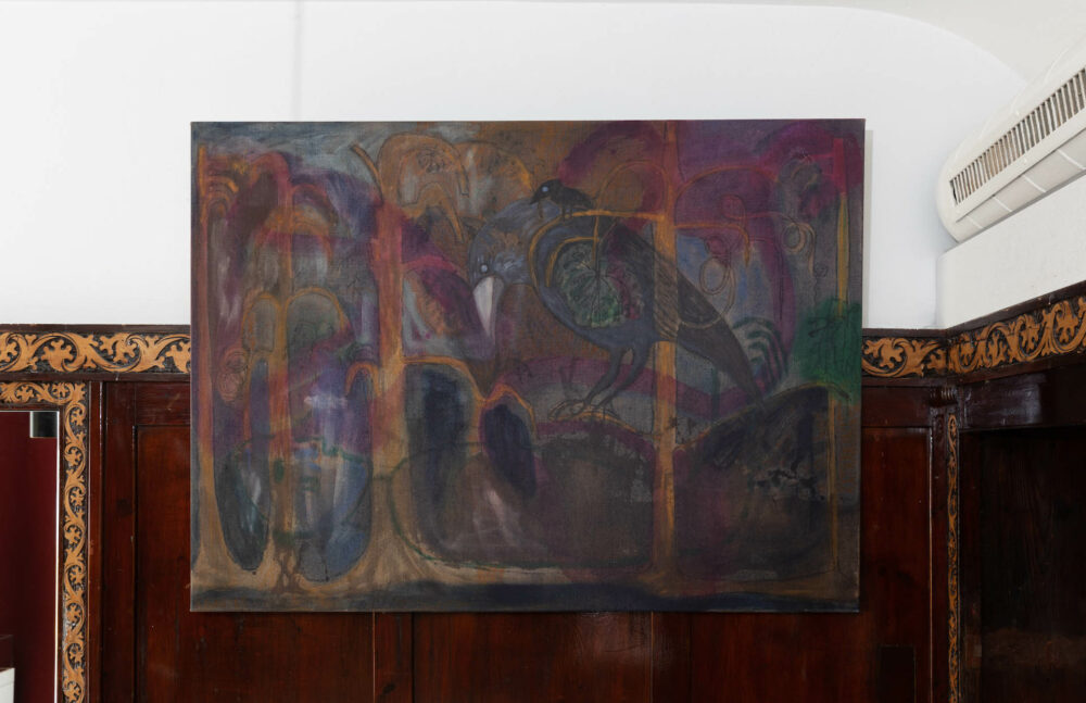 raven and child, spotted on wed jan 20 in vienna, 2021, 96 x 130 cm, Öl, Marker, Textilfarbe auf Leinen